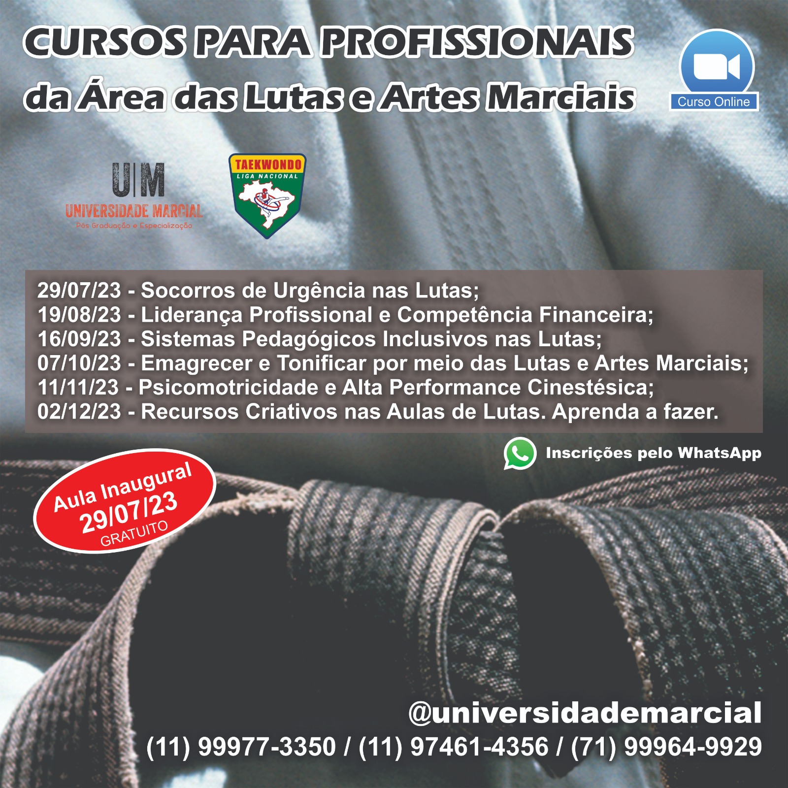 A Universidade Marcial (@universidademarcial), através do Grão Mestre Yeo Jin Kim, com o apoio do Departamento Acadêmico da Liga Nacional de Taekwondo – LNT, divulga o calendário dos cursos livres online para profissionais da área das lutas e artes marciais, para o segundo semestre de 2023.